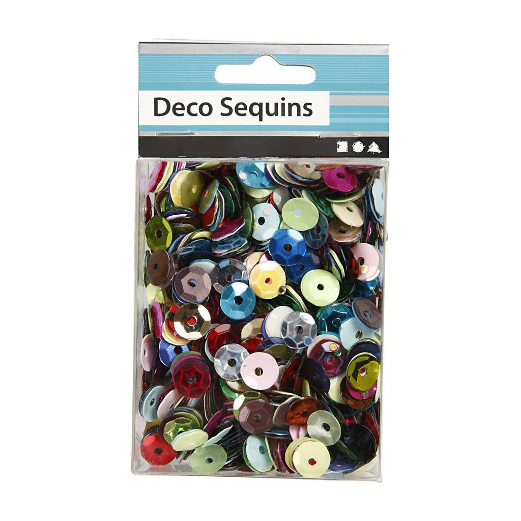 Mix van helder gekleurde, semi-cup, ronde pailletten met een gat in het midden. Set bevat vele verschillende kleuren. Doorsnede: 6 mm.