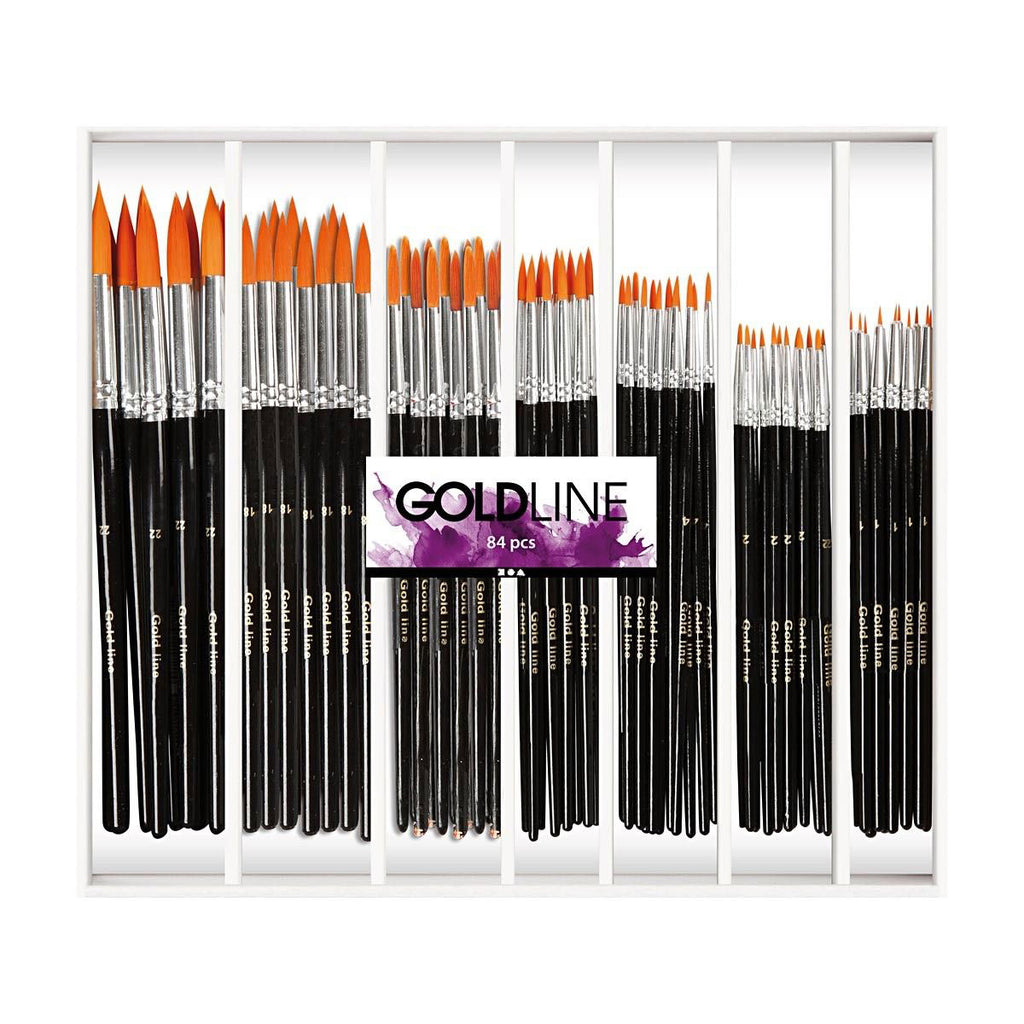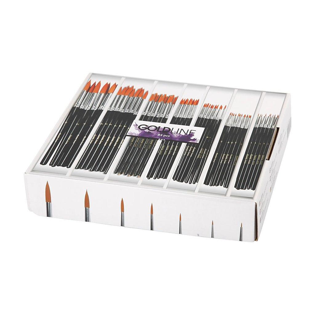 Set van 84 excellente ronde all-round penselen met nylon synthetisch haar en korte houten steel. Geschikt voor zowel dunne als dikke verven. Pakket bevat 7 verschillende maten, van elk 12 stuks. Geleverd in een opslagdoos. Maat penselen: 1, 2, 4, 8, 12, 18, 22. breedte: 2-8 mm.