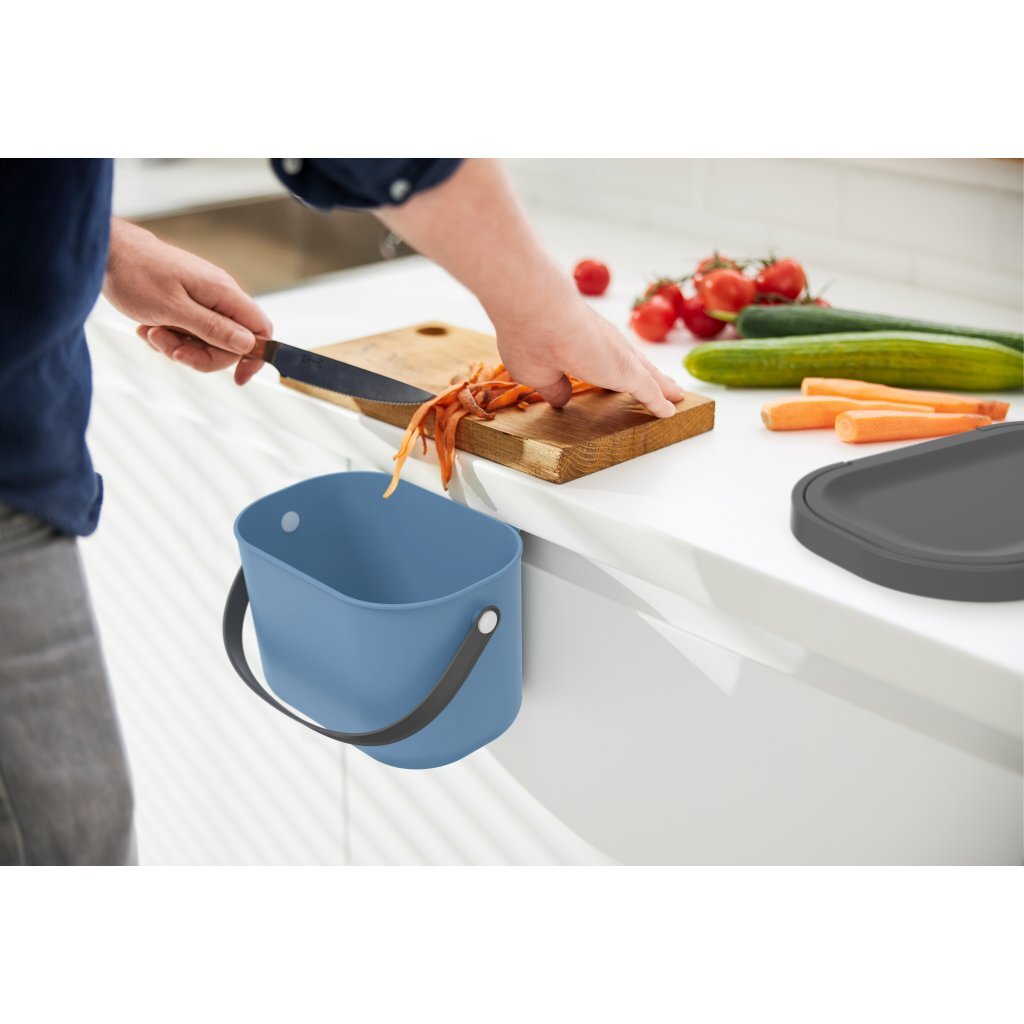 De emmer is de perfecte keukenhulp om organisch afval, maar ook bijvoorbeeld koffiecapsules of afwastabletten, handig en eenvoudig op te vangen.Dankzij het ideale, compacte formaat kan hij zowel op het werkblad worden geplaatst als met het geïntegreerde ophangsysteem aan deuren en lades in de keuken worden gehangen.Dankzij de grote opening staat niets een eenvoudige en schone afvoer in de weg.Bovendien valt de deksel niet altijd dicht, maar blijft hij zonder problemen in geopende stand staan ??of kan indien nodig volledig worden verwijderd.Zodra de emmer vol is, maken de comfortabele handvatten hem gemakkelijk en eenvoudig te dragen.Onze stijlvolle en stijlvolle emmer is verkrijgbaar in 6 verschillende kleuren, zodat er voor ieders smaak iets te vinden is.Overtuig uzelf ervan dat een GFT-bak niet alleen een keukenhulpje kan zijn, maar ook een blikvanger in uw keuken. Inhoud: 3,2 liter. Kleur: blauw.
