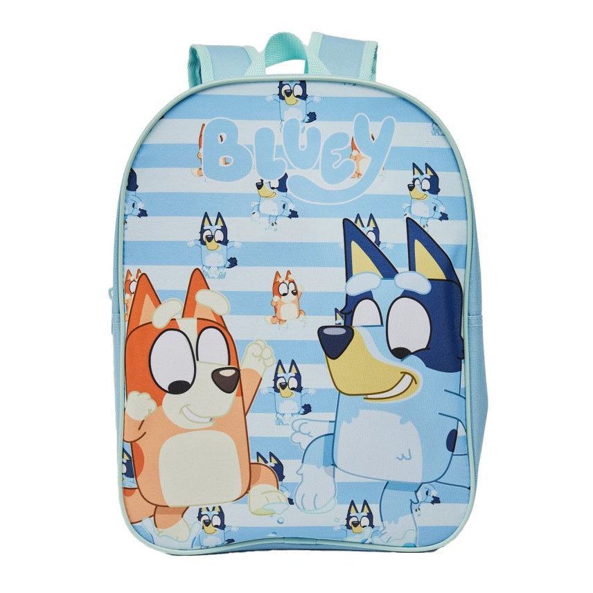 Blauwe Bluey rugzak met vrolijke afbeelding van Bluey en Bingo. De tas heeft verstelbare schouderbanden en is 25 x 10 x 32 centimeter groot.