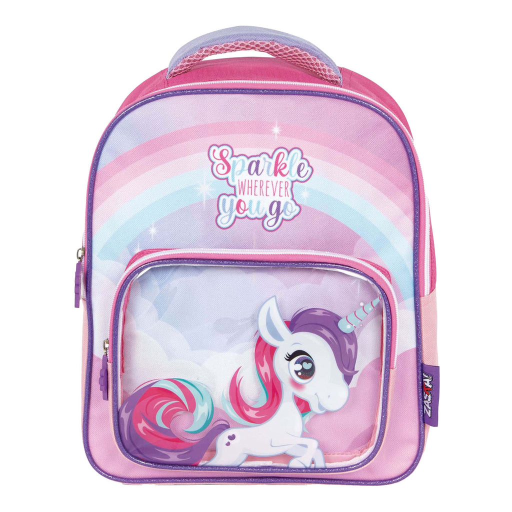 Unicorn rugzak met een vakje aan de voorkant. Afmeting: 30x24,5x11 cm.