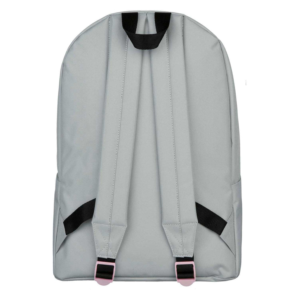 Grijze rugzak met Snoopy-opdruk, voorzien van hoofdvak en voorvak met ritssluiting. De tas is ca. 39 x 29 x 13,5 cm groot en heeft verstelbare schouderbanden en een roze pompon als detail.