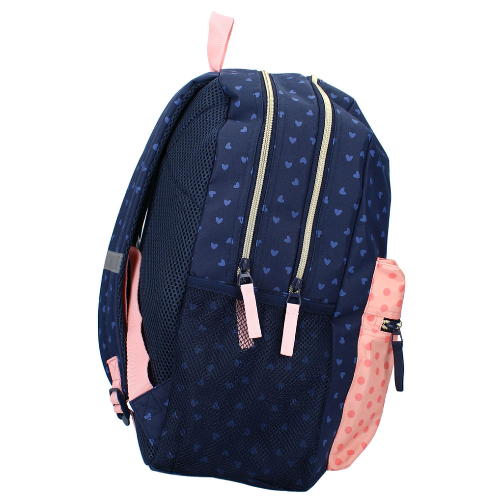 ‘Katten hebben meer plezier’, dat geldt zeker ook voor je kindje als deze tas mee naar school of vriendjes mag. Samen met de schattige kat op deze marineblauwe met roze rugzak van Milky Kiss gaat je kindje op pad. De tas heeft een groot hoofdvak met dubbele rits, waardoor er lekker veel in de tas mee kan. Aan de roze lus aan de bovenkant is de tas makkelijk op te hangen en mee te nemen. De verstelbare schouderbanden zijn zeer comfortabel in gebruik. Het roze voorvak steekt mooi af op het marineblauw en biedt ruimte voor wat kleinere spulletjes.