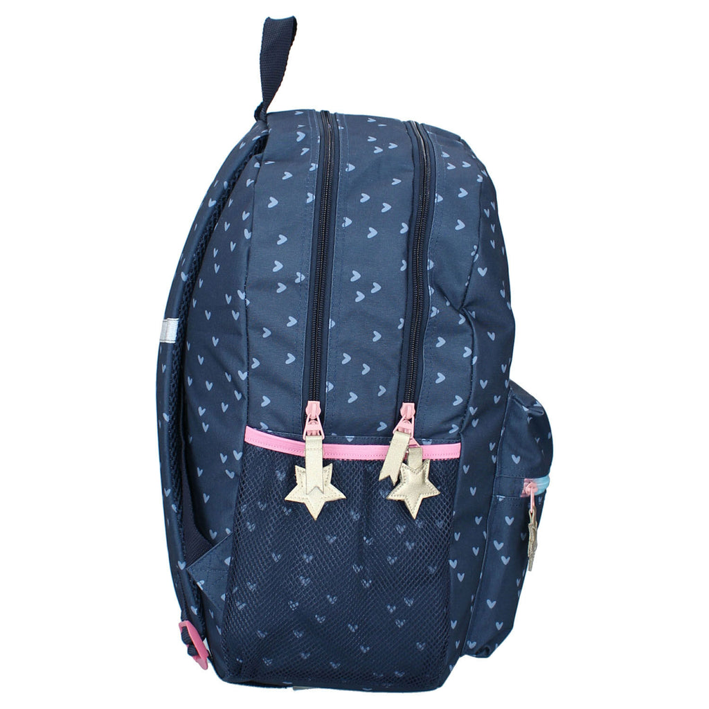 Een pot goud gaat je kindje bij deze rugzak waarschijnlijk niet vinden, maar dat maakt deze tas met regenboog-print er niet minder leuk op. De marineblauwe tas heeft leuke, felgekleurde details zoals de ritssluiting van het voorvak. Daarboven prijkt op de voorkant van de rugzak een kleurrijke regenboog omringd door gouden sterren. De tas is ideaal om mee te nemen naar school of tijdens een dagje weg. Door de dubbele ritssluiting van het hoofdvak kan je kleintje altijd makkelijk bij de inhoud. Aan de zijkant is nog een insteekvak om een klein flesje of pakje drinken in mee te nemen.
