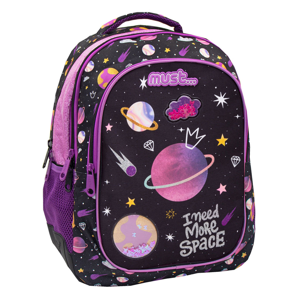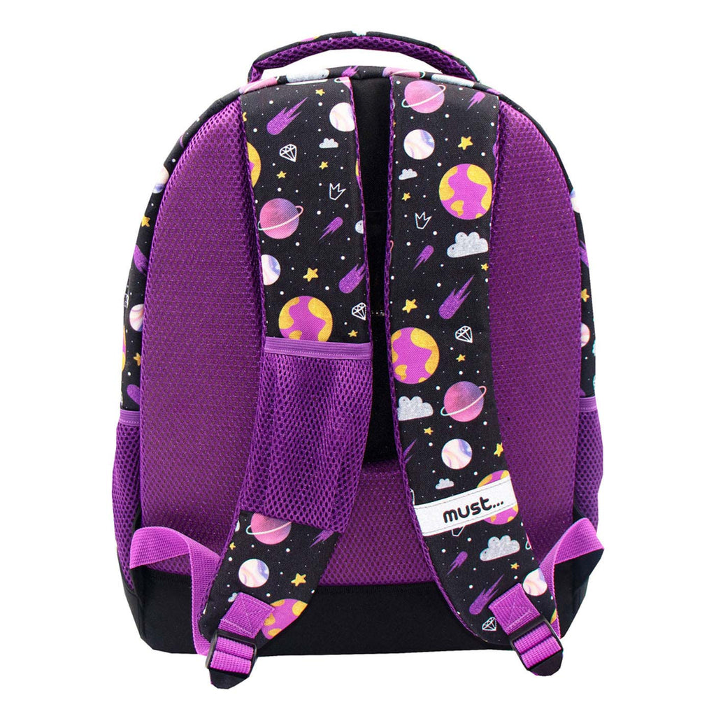Stoere paars/zwarte meidenrugtas met planeten en glitters. Met 5 vakken, verstelbare en verstevigde schouderbanden en coole applicaties. Gemaakt van polyester en geschikt vanaf 3 jaar.