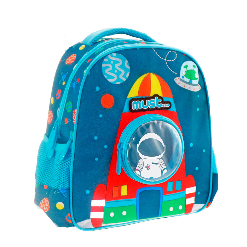 Blauwe rugzak met afbeeldingen van planeten, ufo's, een raket en een astronaut. Het hoofdvak en voorvak zijn af te sluiten met blauwe ritsen.
