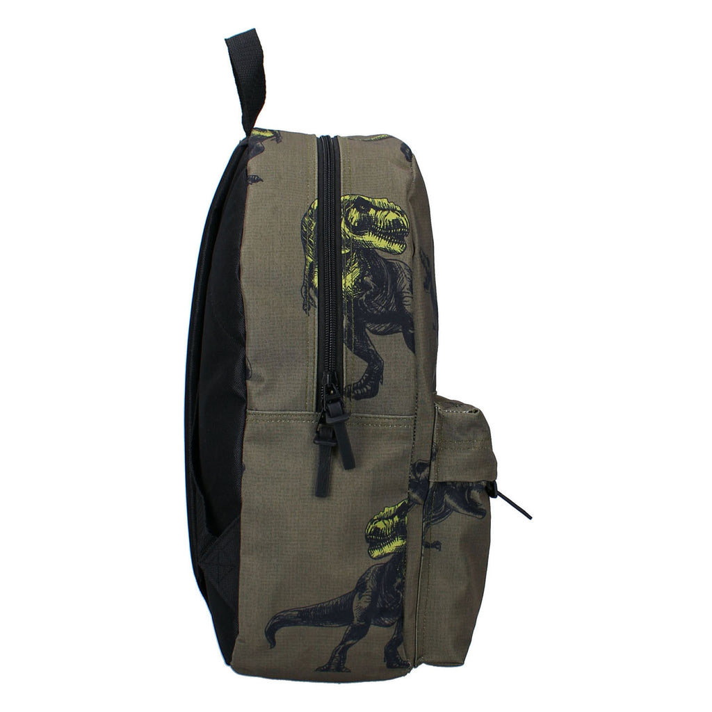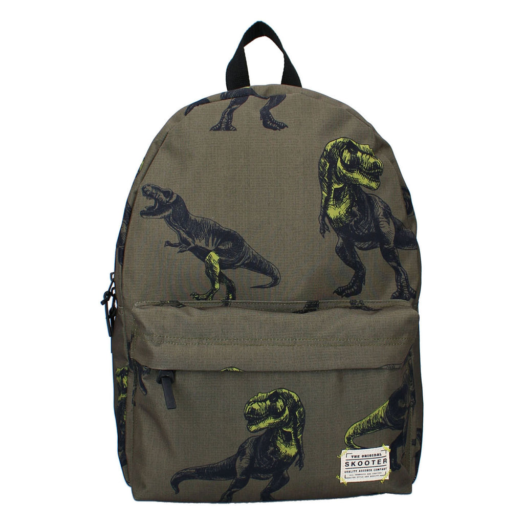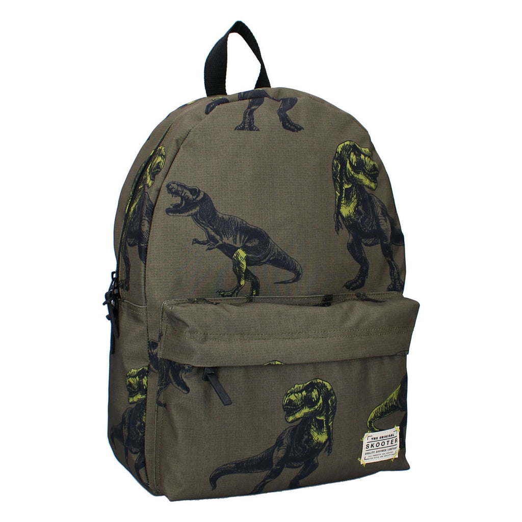 Deze donkergroene rugzak van Skooter heeft een subtiele dinoprint. Daarmee is de tas uitermate geschikt voor wat oudere kinderen die huiverig zijn om een kindertas mee naar school willen. De rugzak is ruim en ideaal om een lunchtrommel, drinken en schoolboeken in mee te nemen. Het voorvak is ook groot, en handig om spullen in te doen die je vaak nodig heeft. De verstelbare schouderbanden zijn heel comfortabel in gebruik. Aan de zwarte lus aan de bovenkant is de tas ook mee te nemen of op te hangen.
