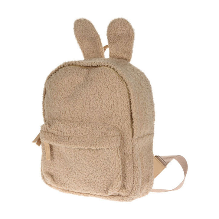 Snoezige rugzak voor kinderen in knuffelzachte teddyuitvoering. De rugzak heeft een groot vak en een kleiner voorvakje, en bovenop de tas zitten twee schattige berenoortjes. De tas is 28 x 10 x 32 cm groot. Ook verkrijgbaar in konijnenvariant.