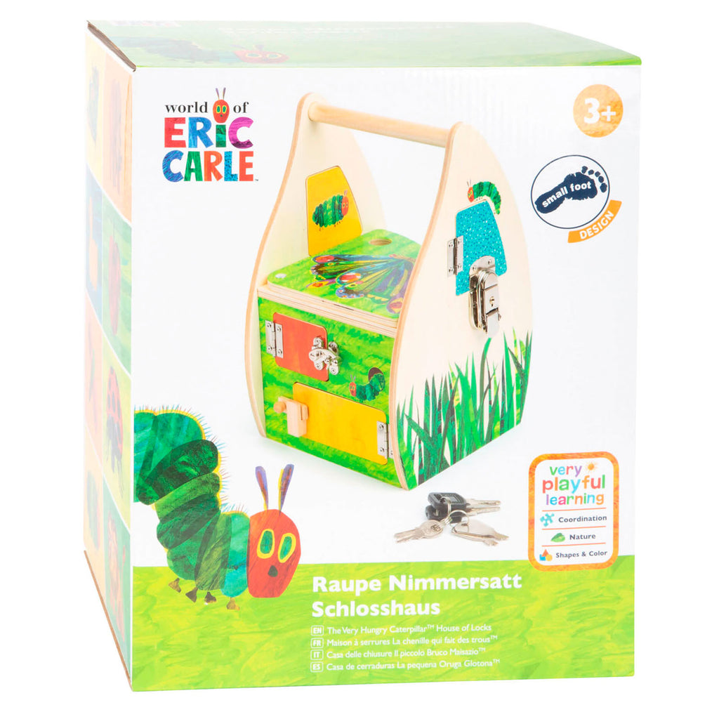 Deze leuke slotenbox van Rupsje Nooitgenoeg heeft verschillende soorten sloten. Het openen en sluiten van de beugelsloten, vatsloten, hendels, scharnieren en een veiligheidsketting traint de fijne motoriek. Extra toevoeging: het huis kan ook worden gebruikt als opbergdoos met geheime compartimenten en valse bodems! Dankzij het handvat aan de bovenkant is kun je de slotenbox ook eenvoudig meenemen. De sloten zijn gemaakt van duurzaam metaal en hout zodat er lang mee gespeeld kan worden. De slotenbox is 28 centimeter hoog.