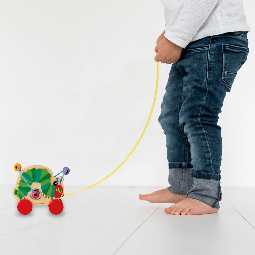 Ga je mee Rupsje Nooitgenoeg, samen de wijde wereld, eh, woonkamer in? Je peuter hoeft niet meer alleen op stap want het Rupsje Nooitgenoeg trekfiguur hobbelt graag mee. En zodra de beentjes willen rusten, kunnen de handjes zich vermaken met het kralendoolhof. Volg het gekleurde draad en schuif de kralen van de ene naar de andere kant. Na deze training van de fijne motoriek en oog-handcoördinatie kan het uitstapje weer vervolgd worden. Fijne reis allebei! Geschikt voor 18 maanden en ouder.