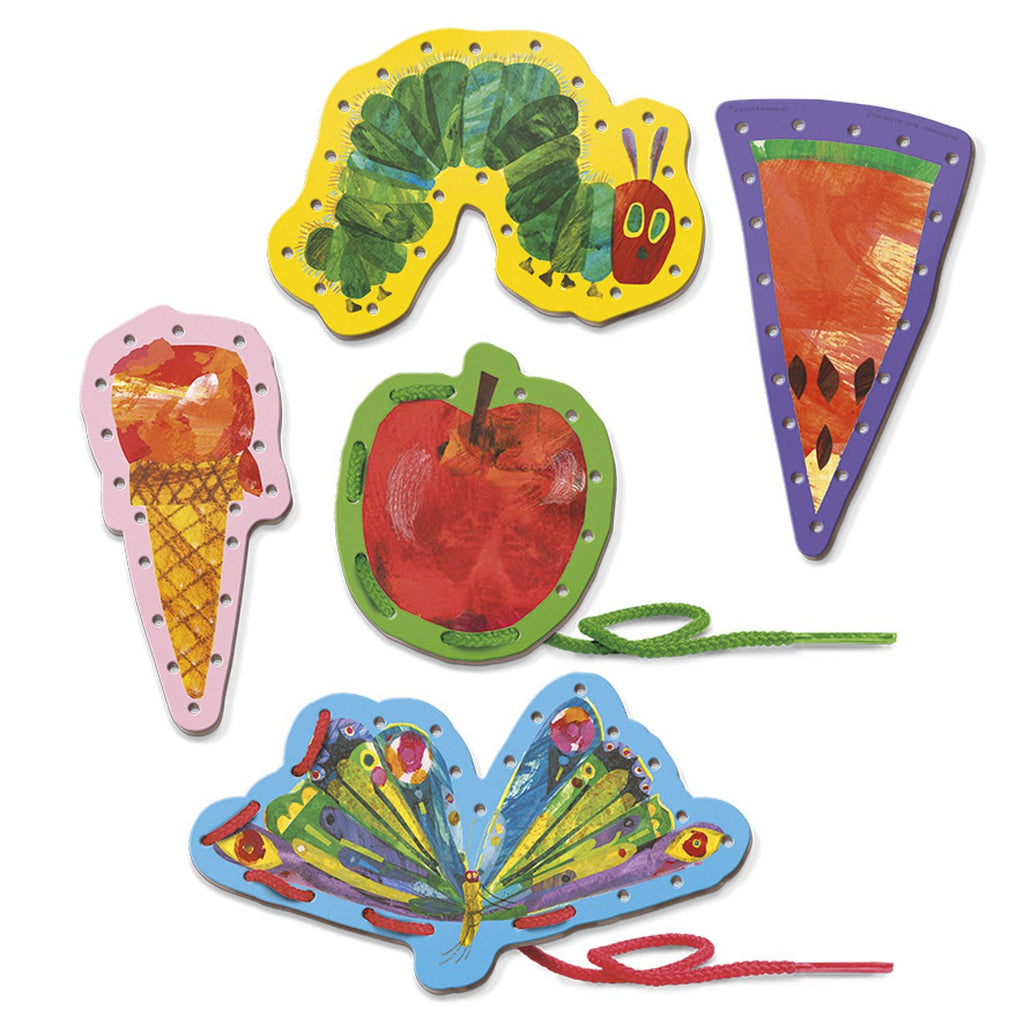 Set van 5 rijgkaarten van rups tot vlinder met appel, meloen en peer incl. rijgveters in verschillende kleuren. Deze stevige set rijgkaarten leent zich perfect voor oefeningen voor de fijne motoriek. Leerlingen hebben de keuze uit 5 kaarten met prachtige afbeeldingen uit het boek Rupsje Nooitgenoeg.