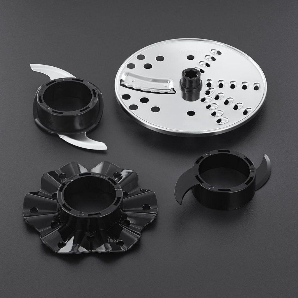 - Inclusief roestvrijstalen messen, omkeerbare snij-/raspschijf, deeghaak en emulgeerschijf
