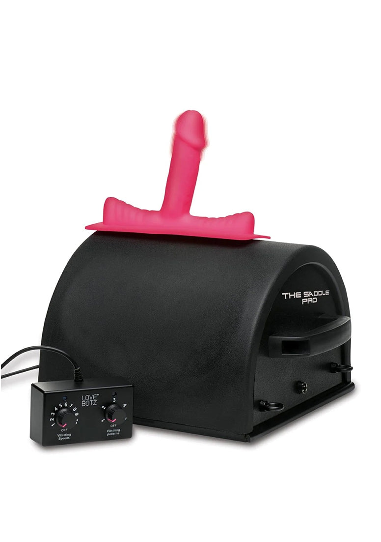 Get back in the saddle and see how long you can ride this Saddle Pro Sex Machine! Built to be durable and handle up to 485 lbs, it's for those of us who want intense, long-lasting pleasure without worrying about getting too wild or rough for the machine to handle! The rideable base begs for your legs to wrap around it and for you to sit on one of the attachments as the intense, rumbling vibrations buzz through the toys inside you! Enjoy the sturdy, solid feeling of metal covered in thick plastic beneath you. Slip in a phthalate-free, premium grade silicone attachment. There are four delicious ones to choose from! Enjoy a large, realistic dildo. Try out a long dildo with a round, ball end to hit your sweet spots such as the A-spot, G-spot or P-spot. Get double penetrated with the dual attachment of a ribbed dildo and a small anal plug! Or enjoy rubbing one out on the delicious nub attachment! Choose between 5 speeds and 10 patterns of ultra-powerful vibration that can be controlled with the remote control! Never worry about dead batteries, either or even recharging! This machine plugs right into the wall so you can get full power all the time! After you're done playing, unplug the machine from the outlet before cleaning, then wipe the machine clean with a toy cleaner and a damp cloth and pat dry. Wash silicone attachments with warm water and toy cleaner between uses. Pat dry and store in a cool, dry location, away from direct sunlight and separated from other silicone toys.
