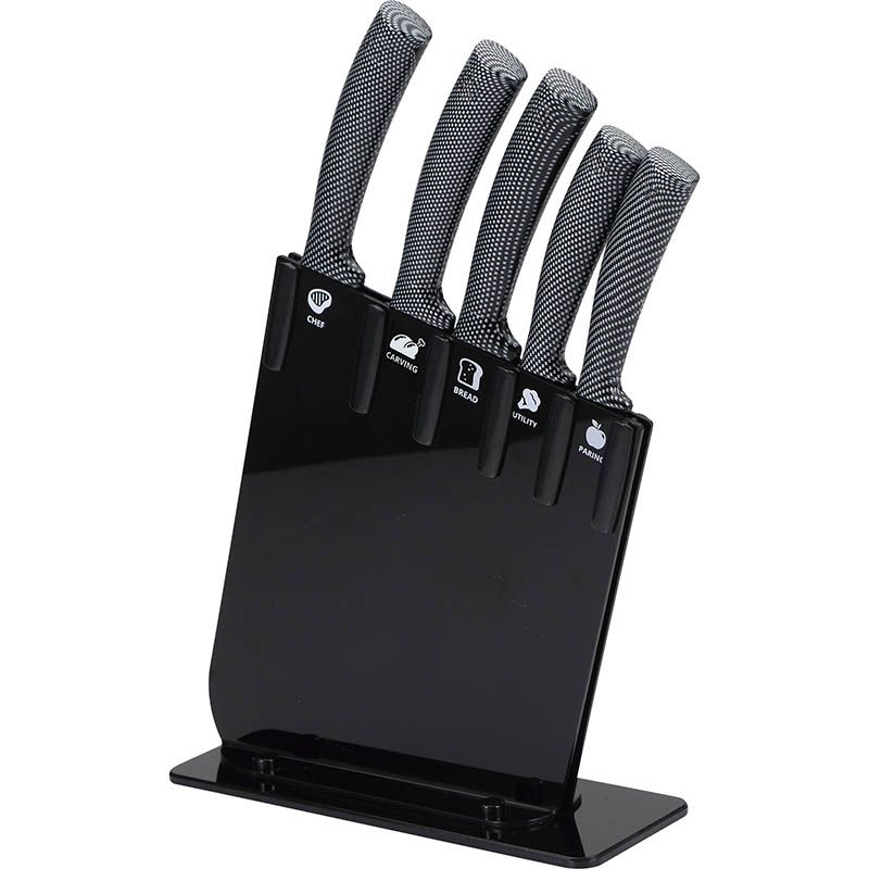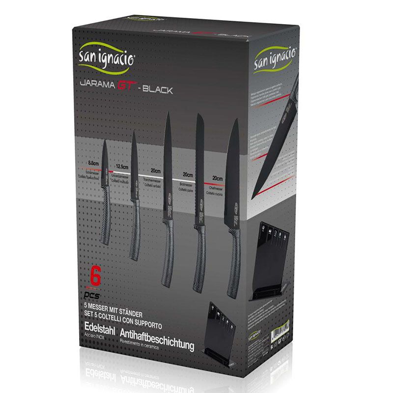 Deze messenset van San Ignacio is uitgevoerd in een stoere zwarte finish en wordt geleverd met een elegante acryl standaard.