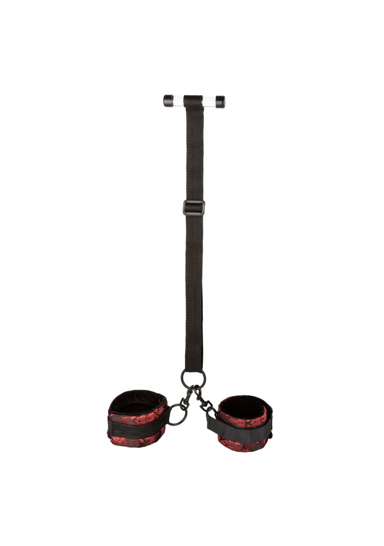 Volledig verstelbare manchetten van het merk Scandal met een zachte pluche voering en een luxe barok motief aan de buitenkant. De boeien worden eenvoudig aan elkaar verbonden met een haaksluiting. Door de bevestigingsband tussen een deur te klemmen is ontsnappen niet meer mogelijk!