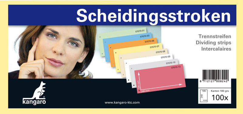 Scheidingsstrook vervaardigd uit 180 grs zuurvrij recycled karton, onbedrukt, 2-gaats ponsing h.o.h. 8 cm aan 1 korte zijde. Kleur geel. Pak a 100 stuks.