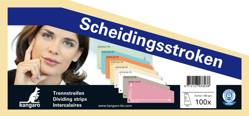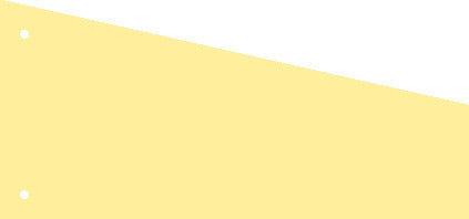 Scheidingsstrook, trapeziumvormig vervaardigd uit 180 grs zuurvrij recycled karton, onbedrukt, 2-gaats ponsing h.o.h. 8 cm aan 1 korte zijde. Kleur geel. Pak a 100 stuks.