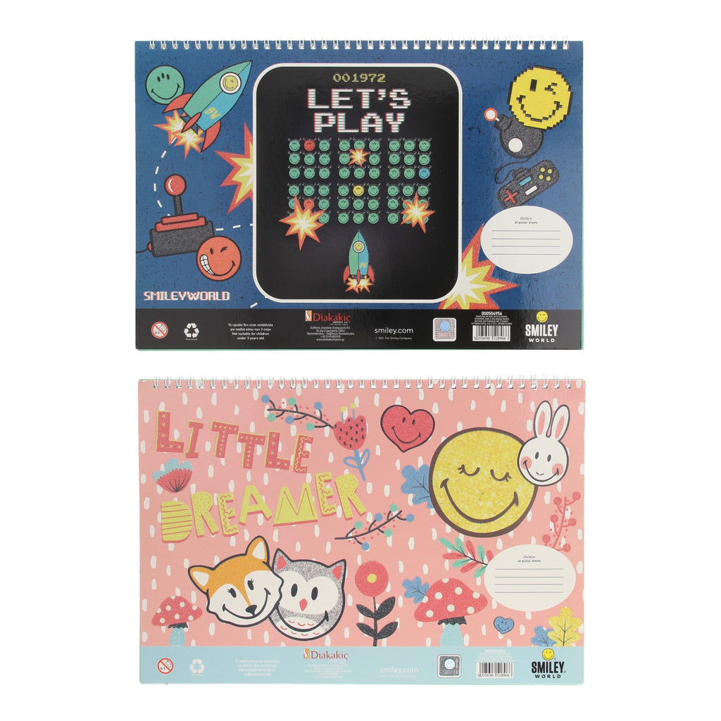 Schetsblok met smileystickers en andere figuren. Inclusief liniaal en stickers. Het schetsboek is 33 bij 23 cm. Geschikt van 3 tot 6 jaar.