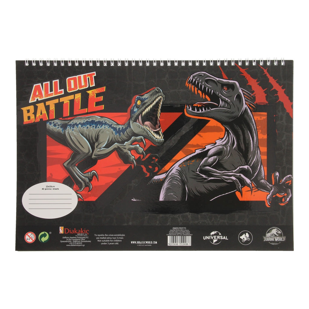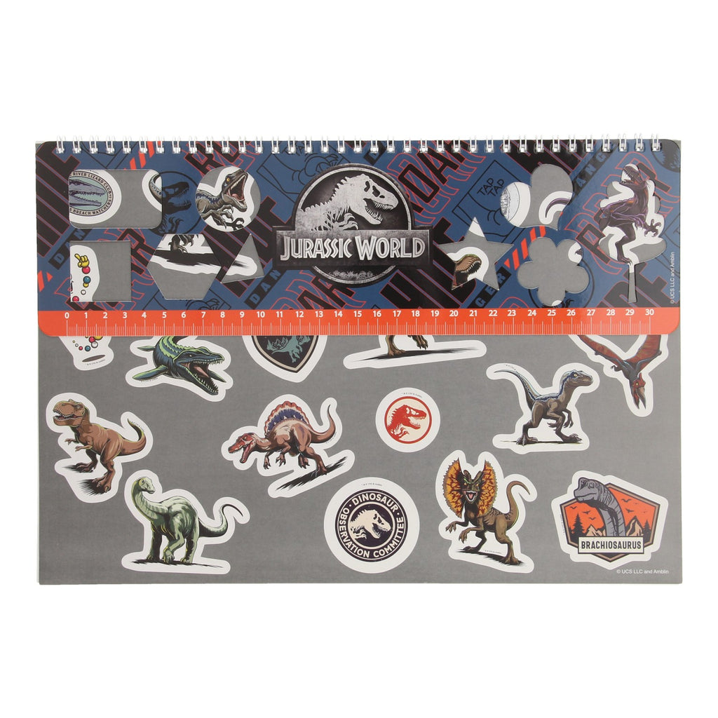 Jurassic dinosaurus schetsblok met verschillende gevaarlijke dino's. Inclusief liniaal en stickers. Het schetsboek is 33 bij 23 centimeter. Inclusief stickers en liniaal. Geschikt van 3 tot 6 jaar.