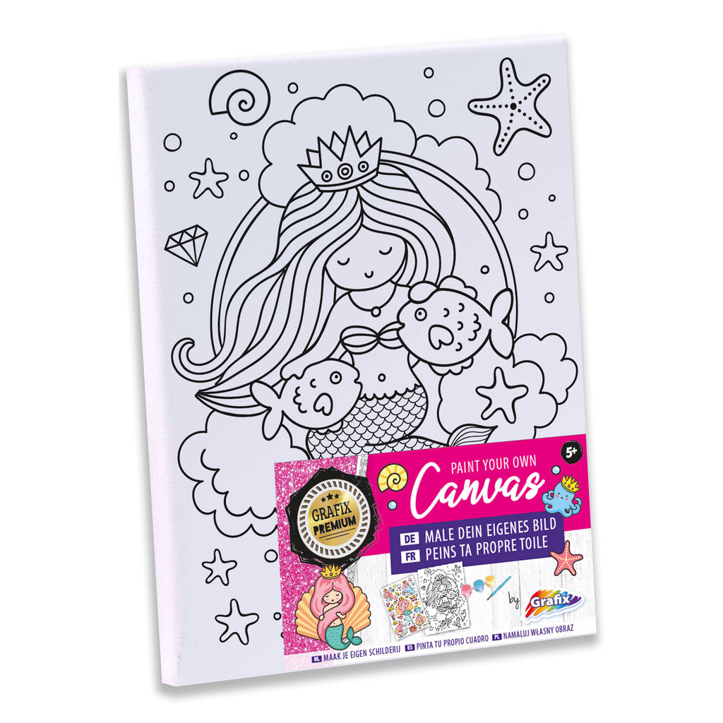Schilder je eigen Canvas met daarop een afbeelding van een vrolijke zeemeermin of een eenhoorn! Bij de knutselset zit een kwast met 3 kleuren verf (rood, blauw en geel) en een metallic stickervel met stickers van de onderwaterwereld! Schilder je eigen Canvas is een leuke activiteit voor een kinderfeestje. Afmeting: 20x15 centimeter.