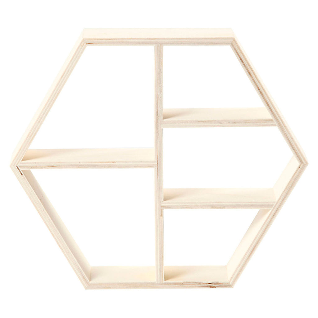 Dit display van licht hout heeft een hexagonale vorm. Je kunt de display verven en/of versieren of gebruiken in de huidige staat. Hang hem aan de muur en vul de 5 vakken met leuke accessoires. Twee vakken zijn 11 centimeter hoog en drie vakken zijn 7 centimeter hoog. De totale afmeting van het display is 25 (h) x 28,5 (b) x 5 (d) centimeter.