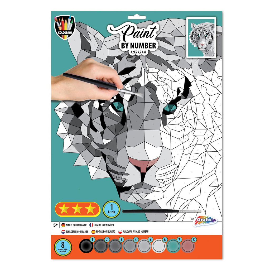 Schilderen op nummer, schilder dit schilderij van deze tijger. Inclusief 8 kleuren verf en penseel. Afmeting: 42 bij 29,7 cm. Geschikt voor kinderen van 5 tot 8 jaar oud.