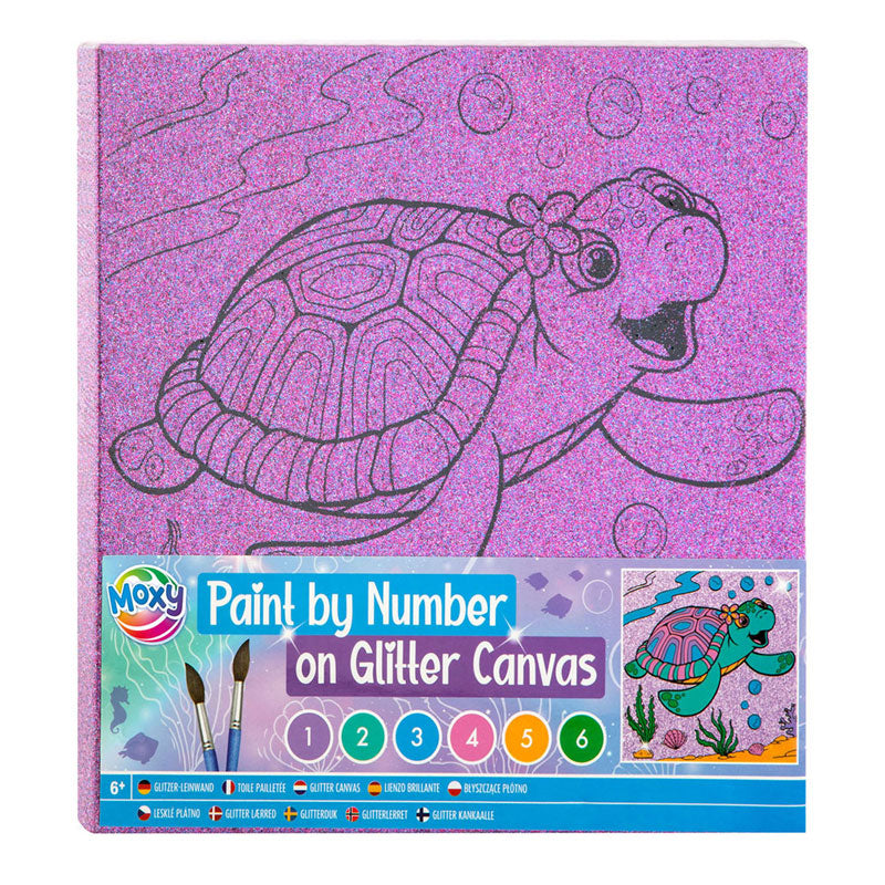 Schilderen op nummer op een glittercanvas (eenhoorn, schildpad of bloem). Inclusief 6 kleuren verf en 2 kwastjes. Afmetingen canvas: 25 x 25 centimeter. Geschikt voor kinderen van 6 jaar en ouder.