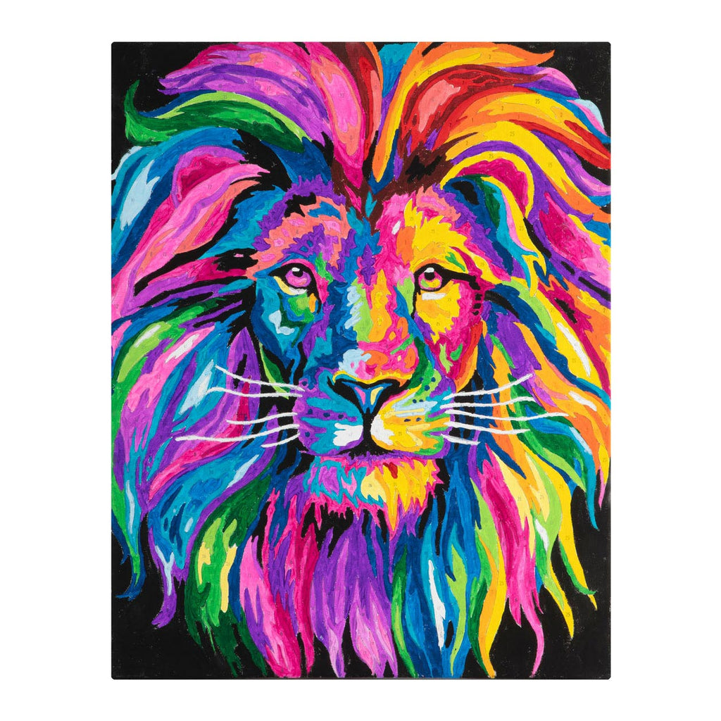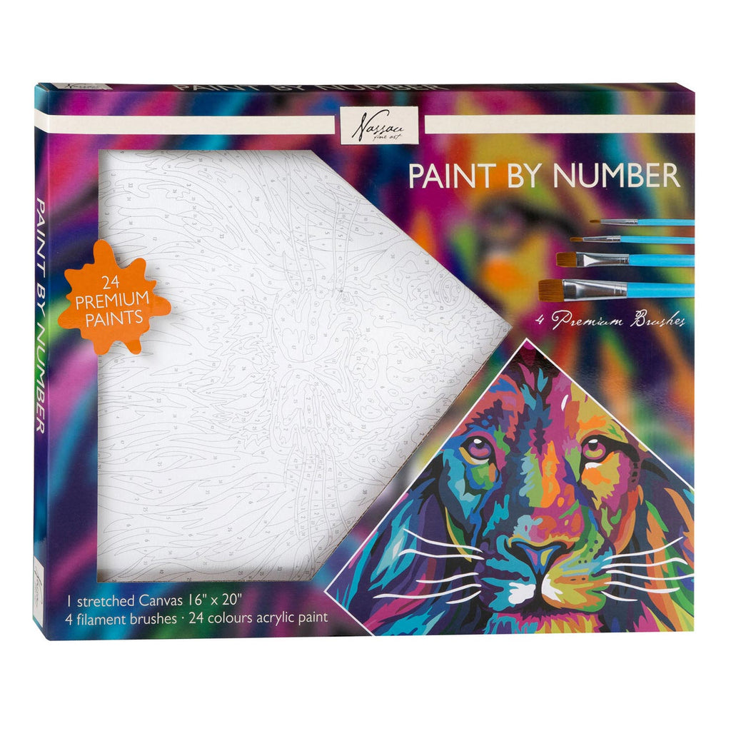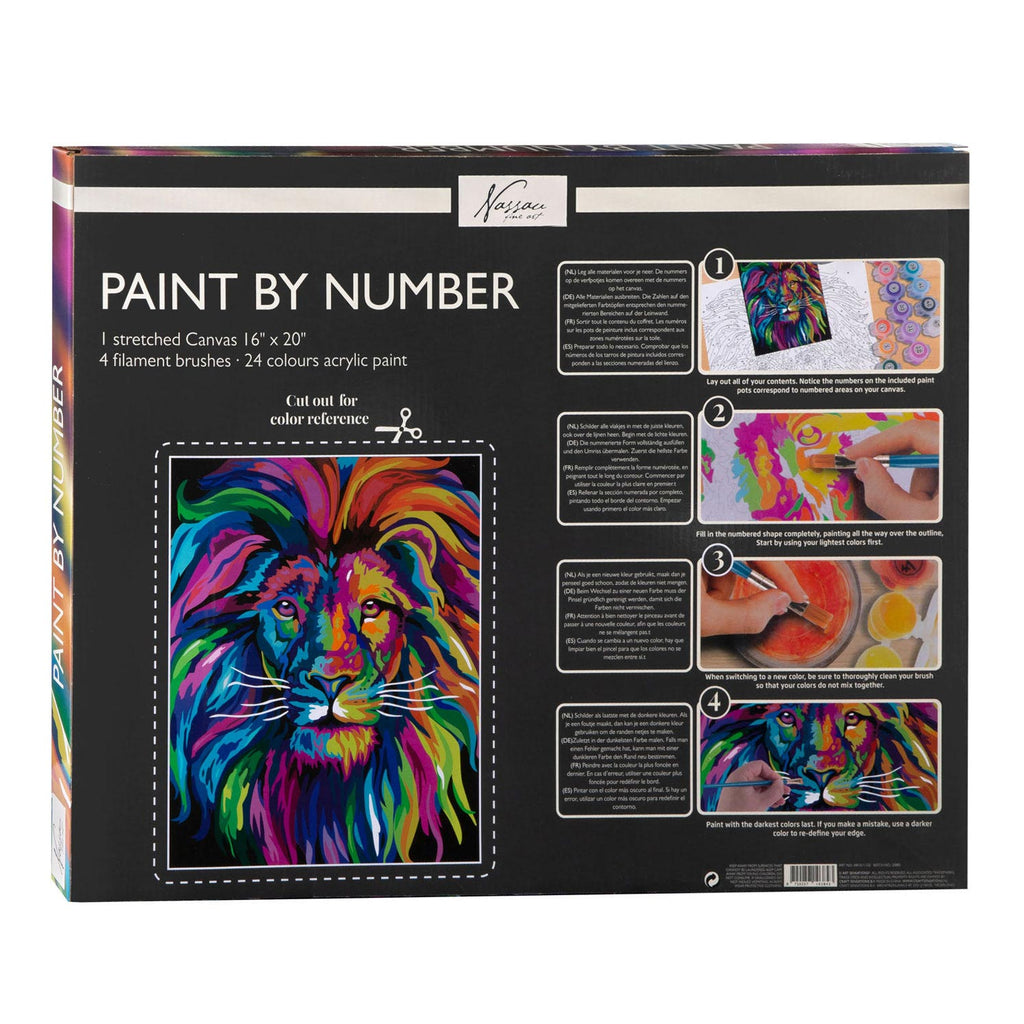 Schilderen op nummer leeuw, 24 kleuren verf, 4 penselen. Canvas is 50 bij 40 centimeter.
