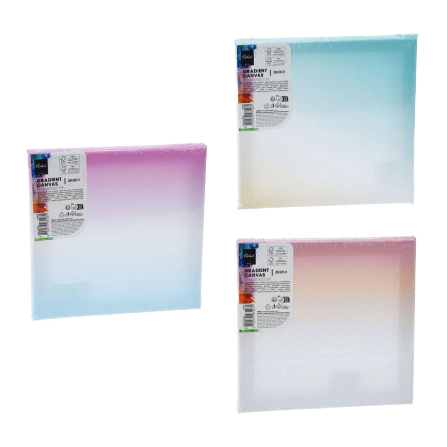 Schilderdoek met een afmeting van 20 x 20 cm. De canvassen zijn beschilderd met kleurverloop.
