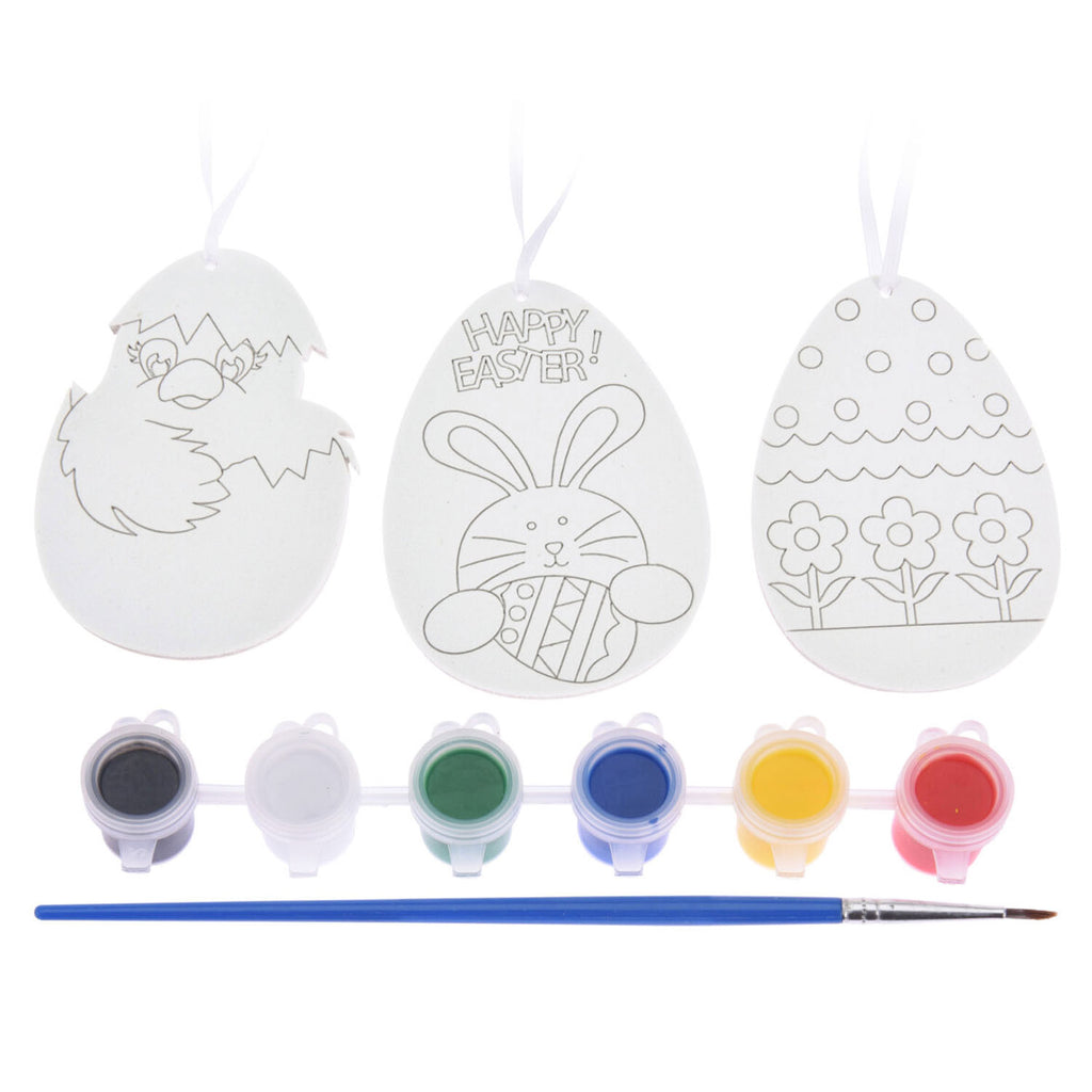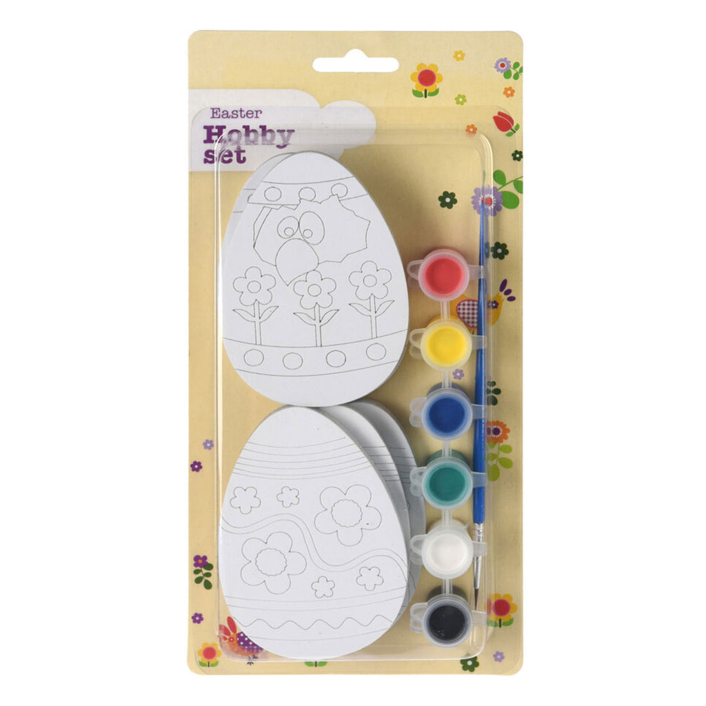 Eieren schilderset met zes verschillende kleuren verf en een penseel. Rijg het touwtje aan het ei en de versiering is klaar om op te hangen.