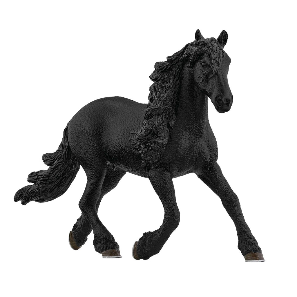 Hij staat er majestueus bij, deze pikzwarte Schleich Horse Club Friese hengst. Typisch voor zijn ras is er geen lichte haar te vinden tussen zijn glanzende vacht. Met zijn forse gestalte en prachtige lange manen slaat hij een geweldig figuur voor de koets. Maar ook als dressuurpaard is hij erg gewild.