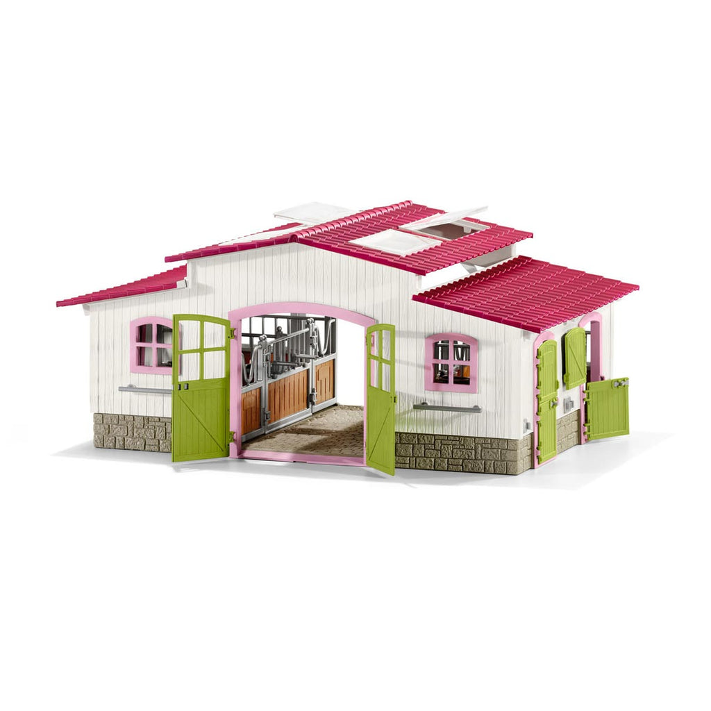 Stal je paarden in deze handige manege van Schleich. je kunt je paarden in de stal zetten en bij iedere stal zit ook een buitengedeelte, zodat de paarden met lekker weer niet steeds binnen hoeven te staan. Bij de manege krijg je een paard en haar veulen, geef je ze direct een mooi plekje? Vergeet ook niet af en toe op de paarden te rijden, dit zal de bijgeleverde ruiter vast fijn vinden.