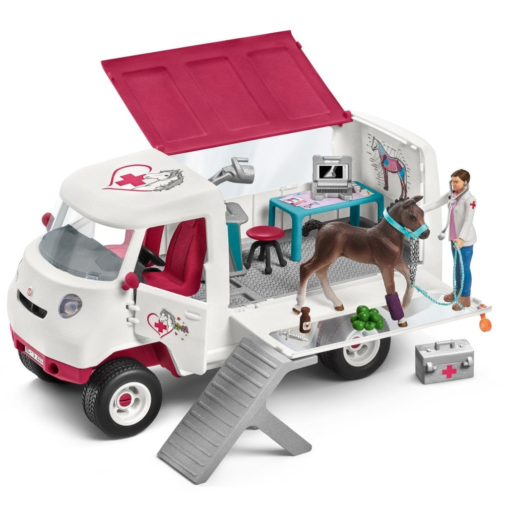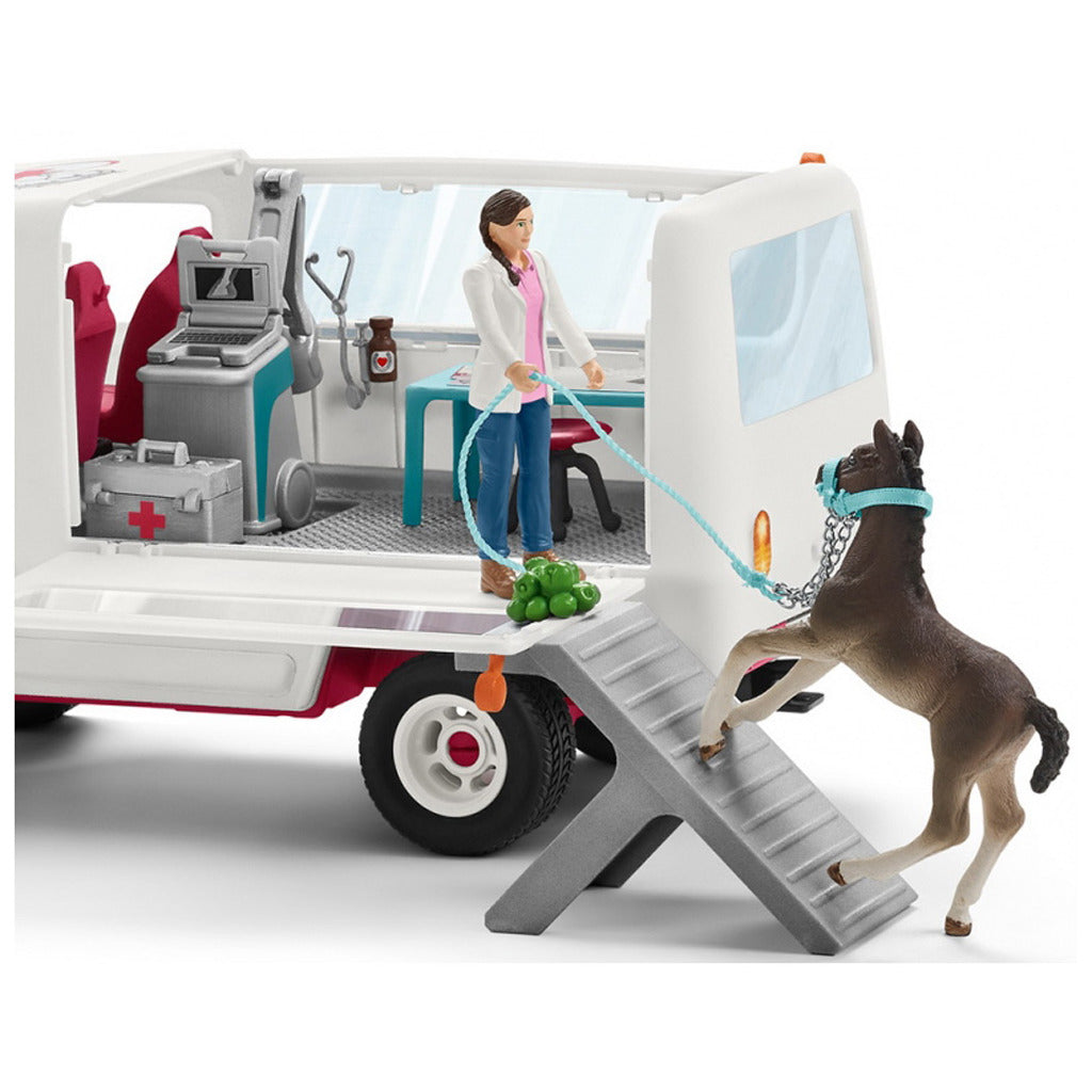 Schleich mobiele dierenarts met Hannover veulen. Het dak en de zijwand van de wagen kunnen open. Schleich is sinds begin jaren '80 bezig met het ontwikkelen van dierenminiaturen. De dieren zijn van kunststof, op schaal gemaakt en handbeschilderd.