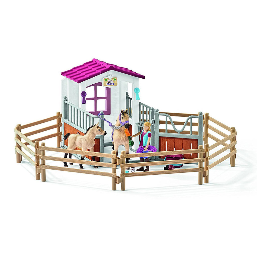 Schleich paardenbox met arabische paarden en verzorgster. Schleich is sinds begin jaren '80 bezig met het ontwikkelen van dierenminiaturen. De dieren zijn van kunststof, op schaal gemaakt en handbeschilderd.