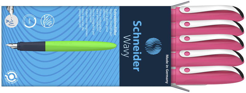 Deze beginnersvulpen Wavy is de perfecte pen om te beginnen met leren schrijven met een vulpen. De vulpen is voorzien van een drukbestendige roestvrijstalen penpunt A met iridiumpunt. De ergonomisch rubberen greep voor rechts- en linkshandigen zorgt voor een correcte positionering en de grote vingeroppervlakken voorkomen drukpunten. Wavy is geschikt voor zowel standaard inktpatronen als converters en daarmee ideaal voor dagelijks schoolgebruik. Houderkleur roze. Schrijfkleur blauw. De vulpen is verkrijgbaar in diverse heldere kleuren en is CO2-neutraal geproduceerd.