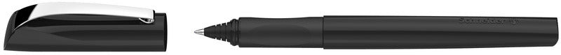 Rollerbal met een ergonomisch gripprofiel. Modern ontwerp met opvallende rondingen. Slijtvaste roestvrijstalen punt en standaard inktcartridges, koningsblauw, uitwisbaar. Stevige metalen clip. Geschikt voor rechts- en linkshandigen. Kleur: zwart.