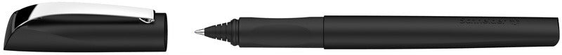 Rollerbal met elegante metallic look. Modern ontwerp met opvallende rondingen en een ergonomisch gripprofiel. Slijtvaste roestvrijstalen punt en standaard inktcartridges, koningsblauw, uitwisbaar. Stevige metalen clip. Geschikt voor rechts- en linkshandigen. Kleur: zwart.