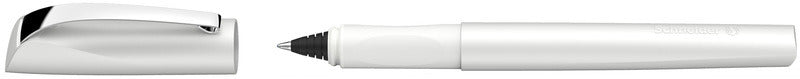 Rollerbal met elegante metallic look. Modern ontwerp met opvallende rondingen en een ergonomisch gripprofiel. Slijtvaste roestvrijstalen punt en standaard inktcartridges, koningsblauw, uitwisbaar. Stevige metalen clip. Geschikt voor rechts- en linkshandigen. Kleur: parel wit.