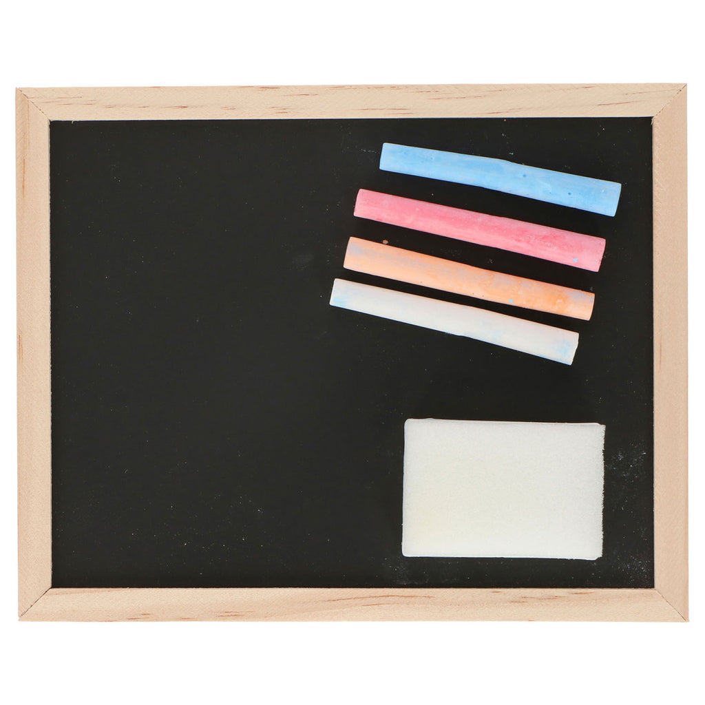 Schoolbord met 4 kleuren krijtjes en een spons.