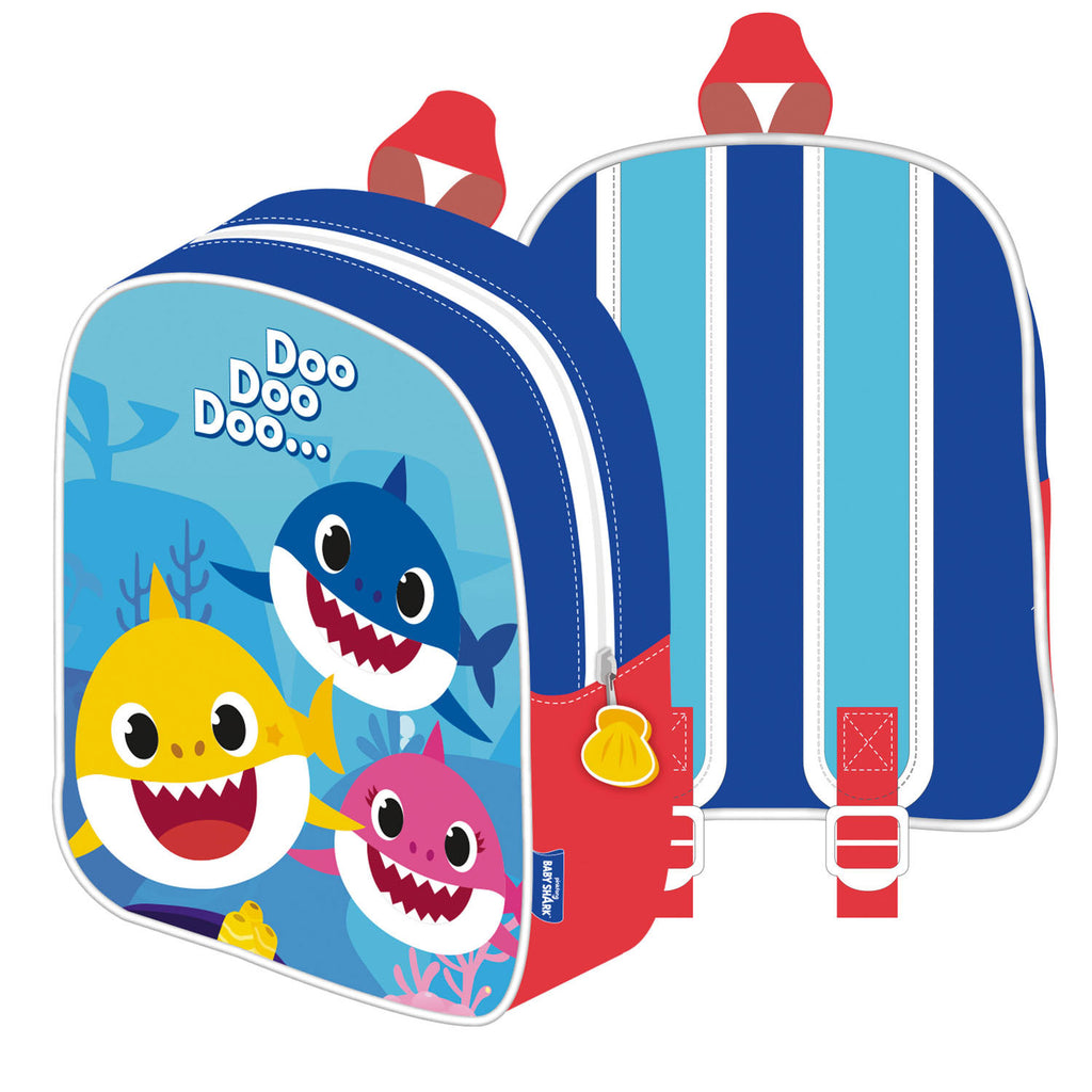 Schoolrugzak met 1 vak en aan de voorkant een afbeelding van Baby Shark en zijn ouders. Rugzak is lichtblauw en donkerblauw met rode accenten. Het lipje van de rits is in de vorm van een schelp. Afmetingen: 24 bij 20 bij 10 centimeter.