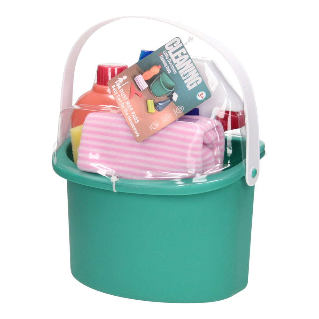 Schoonmaakset van kunststof. Alle onderdelen passen in de emmer. Inhoud: emmer, fles schoonmaakmiddel, spuitfles, spons, stofdoek en trekker. Emmer is 15 bij 10 bij 10 cm, trekker 12 bij 12 cm. Geschikt van 3 tot 6 jaar.