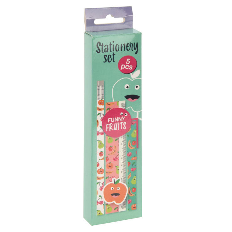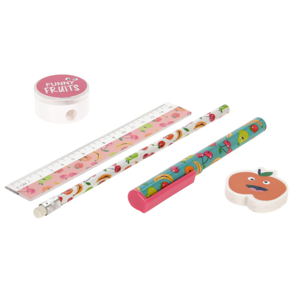 Schrijfwarensetje in grappig fruitthema. De 5-delige set bevat een pen met dop, een potlood, een liniaal, een puntenslijper en een gum. Niet geschikt voor kinderen jonger dan 3 jaar.