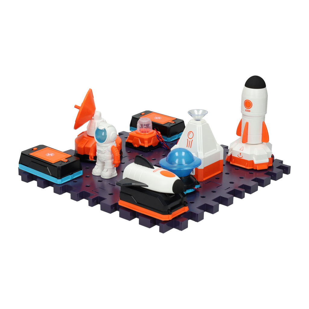 Educatieve bouwset van kunststof met ruimtevaartthema. Bevat o.a. een raket, astronaut, radar, lampjes en geluidseffecten. Geschikt voor kinderen vanaf 8 jaar en werkt op batterijen.