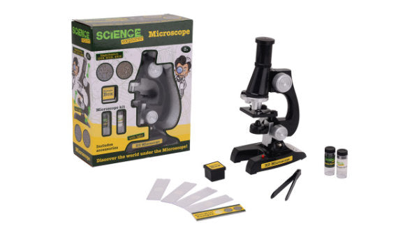 Microscoop om 100x, 200x en 450x te vergroten, met lampje. Inclusief accessoires: microscoop kit, glaasjes om materiaal op te leggen, bakjes en een pincet. Geschikt voor kinderen vanaf 8 jaar.