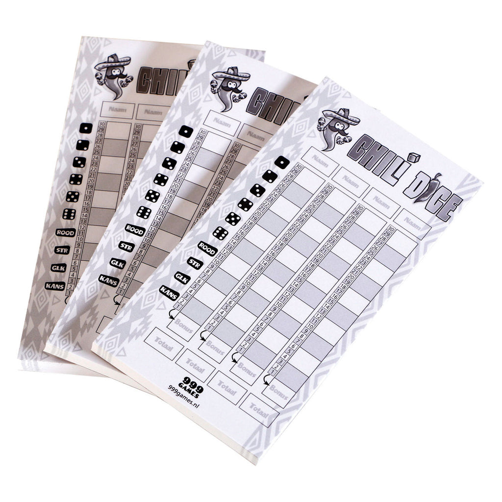 Heb je al zoveel Chili Dice gespeeld dat je al door je scoreblokken heen bent? In dit pakket zitten drie aanvullende scoreblokken waarmee alle spelers die hun blok vol hebben gespeeld weer vooruit kunnen! 3 stuks.