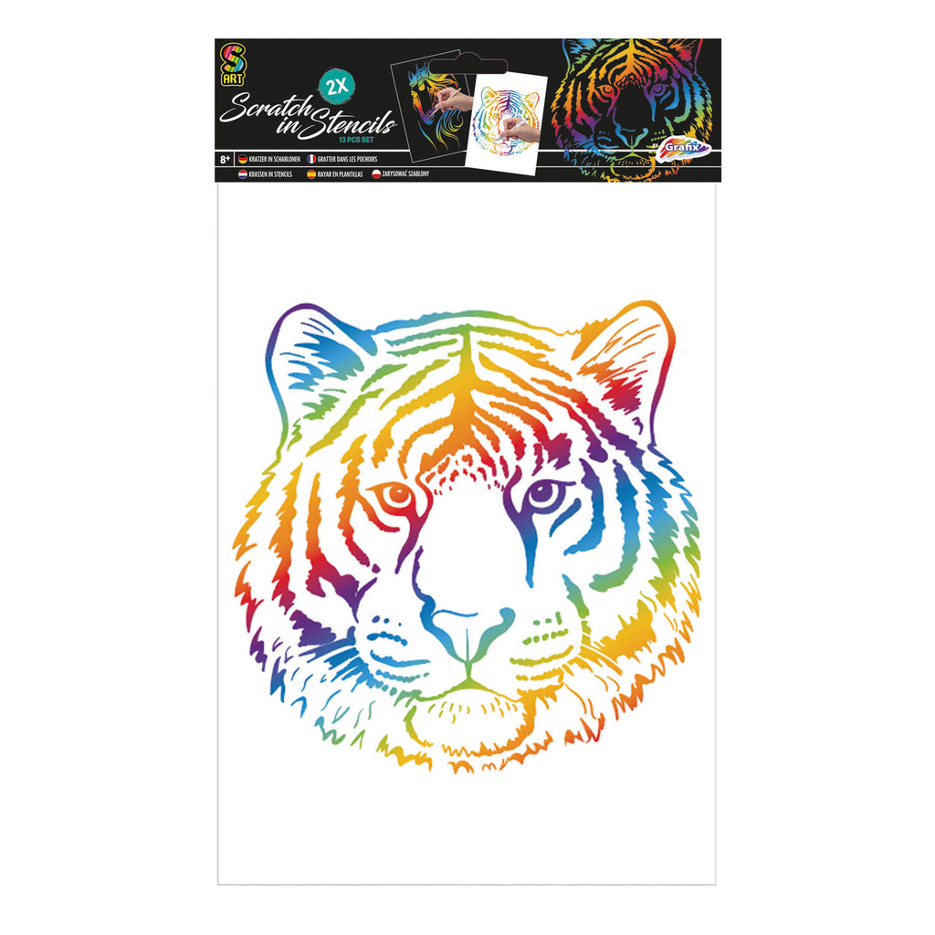 Scratch Set Leeuw en Vogel (zwart-wit) met scratchpen en gekleurde gelpennen.
