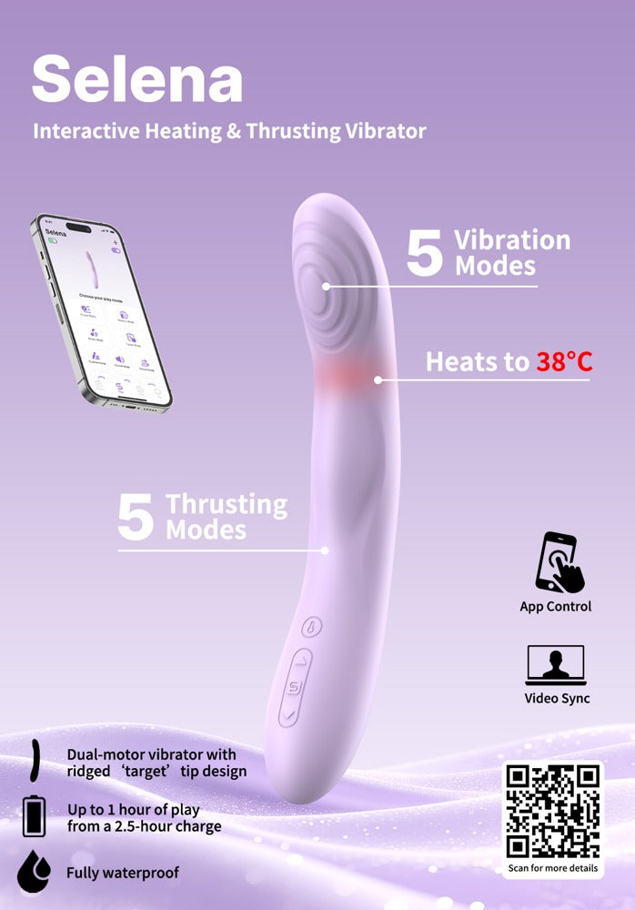 The Heating & Thrusting Vibrator Selena by SVAKOM is in an ergonomically curved shape. Its flattened head combines intense vibrations with sensual thrusts for unique rhythmic stimulation. The gentle wavy textures intensify the sensations even more. The warming function (up to 38°C) provides comfortable pleasure. It is perfect for targeted pleasure spot stimulation inside and outside the body. The G-spot and clitoris in particular will enjoy an intense massage! The silky soft silicone vibrator can also be used in the bath and shower because it is waterproof.