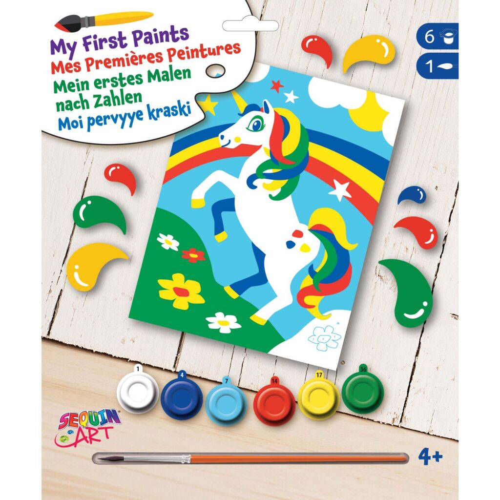 Sequin Art schilderen op nummer eenhoorn met 6 kleuren verf en penseel. Geschikt voor kinderen vanaf 4 jaar.