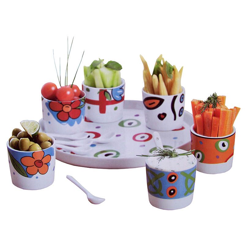 - 6 kleurige kommen (rond 7cm, hoog 6cm),