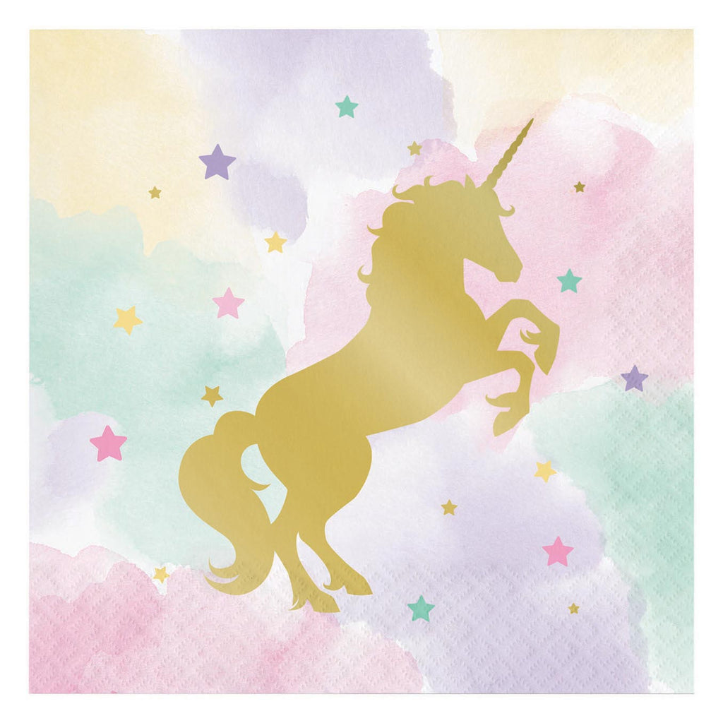 Papieren servetten met het thema 'unicorn sparkle'. De servetten hebben een uitgevouwen maat van 33x33cm en zitten per 16 stuks verpakt. Perfect voor een unicorn kinderfeestje!